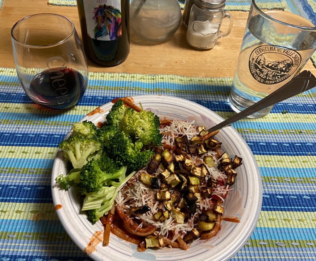 - While that’s simmering cook the noodles, steam broccoli, and cook eggplant in the air fryer in some EVOO and salt and pepper.